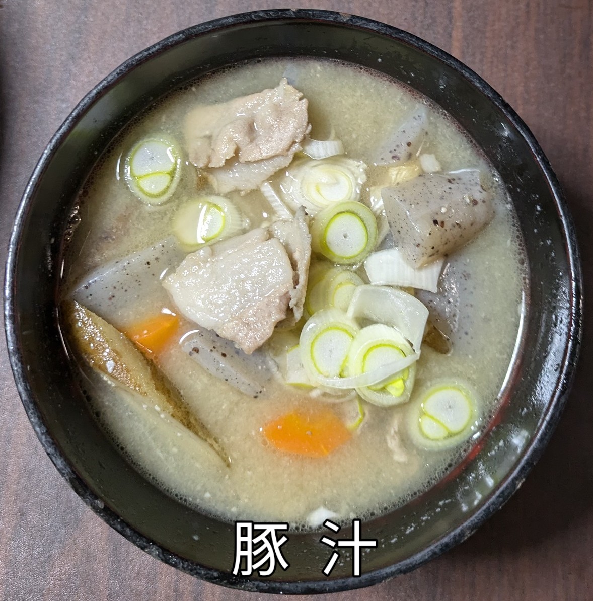 男料理(夕食)    豚汁   豚肉  大根  人参 牛蒡  蒟蒻  長ねぎ