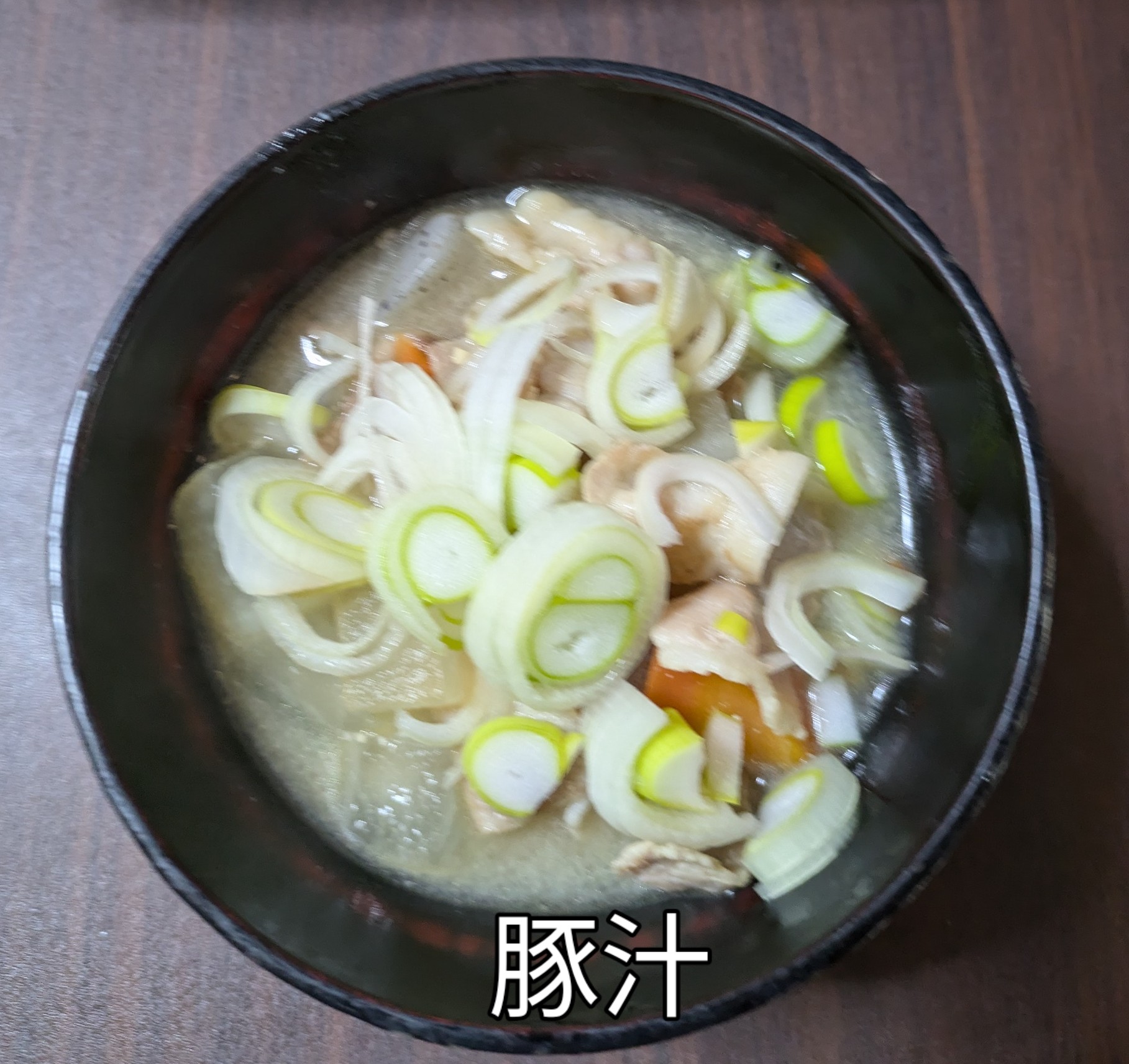 男料理(夕食)豚汁        豚肉  人参  大根  蒟蒻    長ねぎ入り