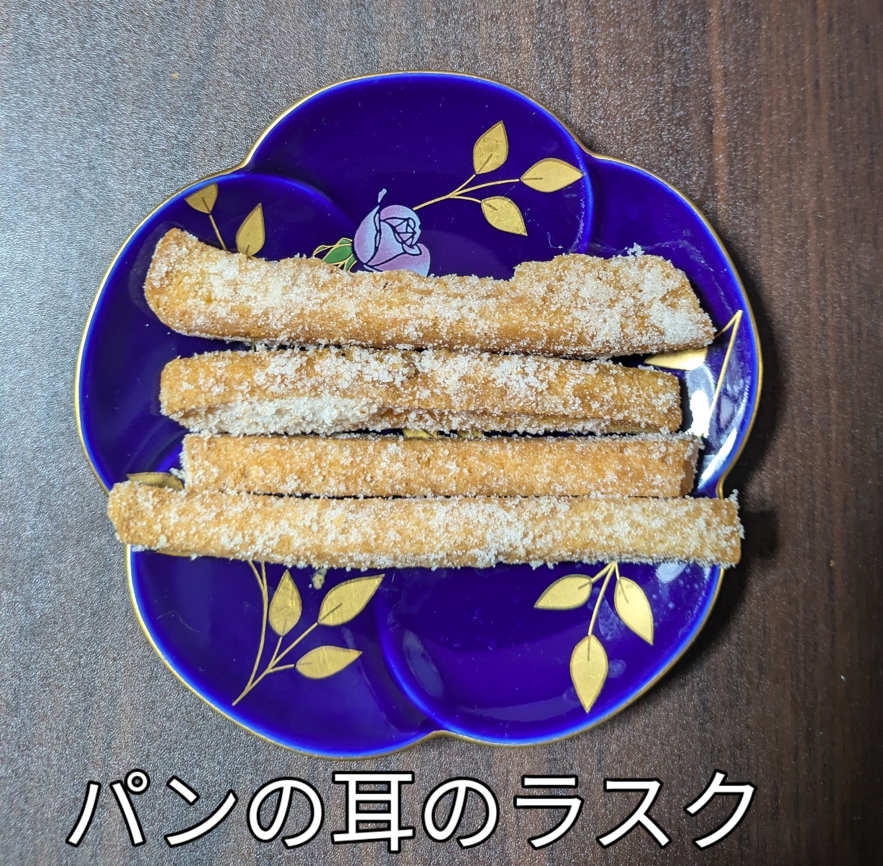 パン屋さんでパンの耳を揚げたラスクを買いました  砂糖がたくさん付いて甘いので    4本づつコーヒータイムに食べました