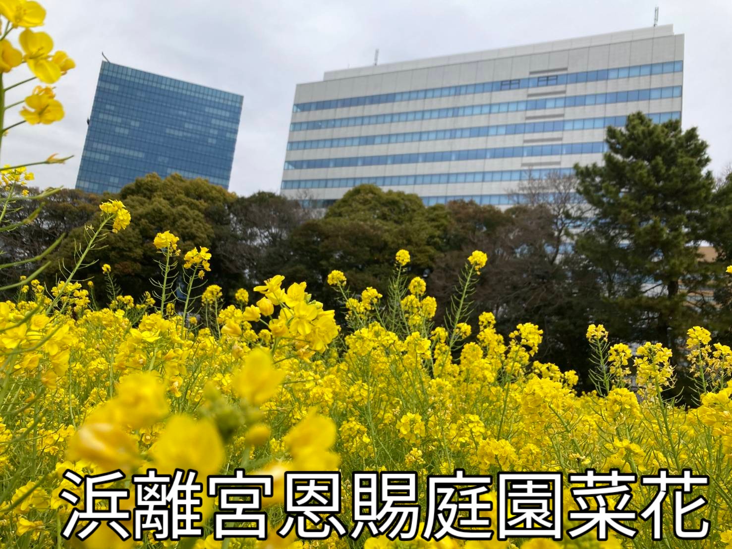 浜離宮恩賜庭園の菜の花畑と高層ビル群をコラボ撮影しました