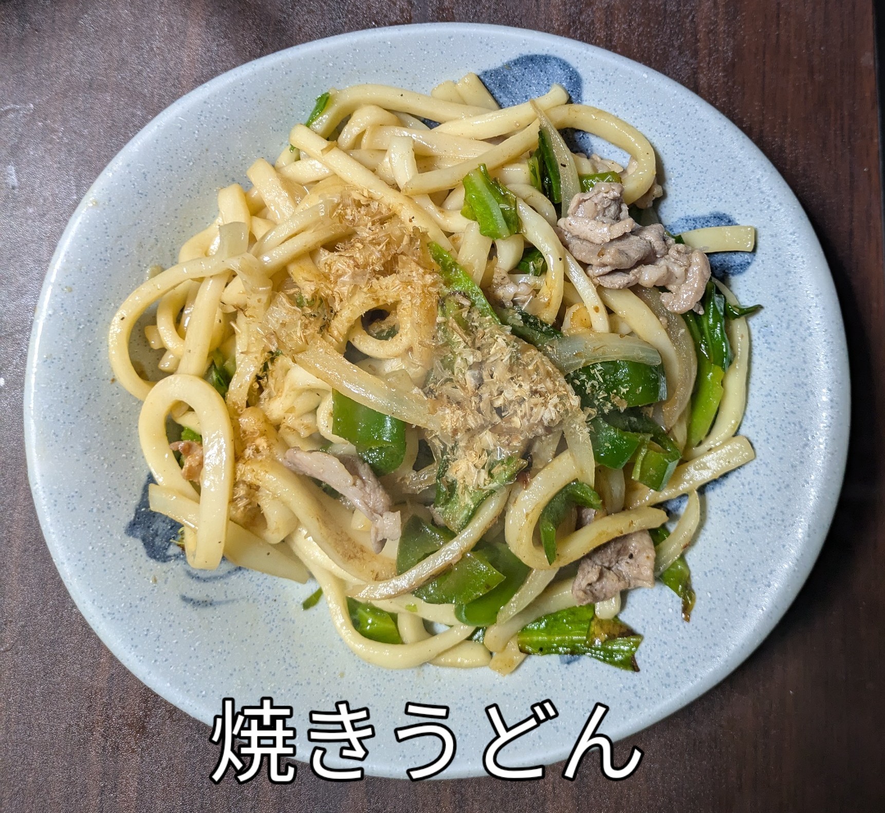 男料理(昼食)焼きうどん   豚肉  長ねぎ入り  鰹節をかけました