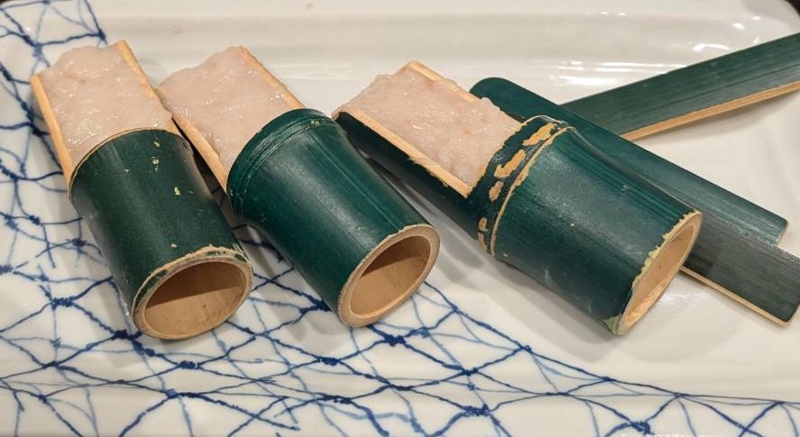 カニのすり身が竹の中に入っていて箸で 鍋にカットして入れました