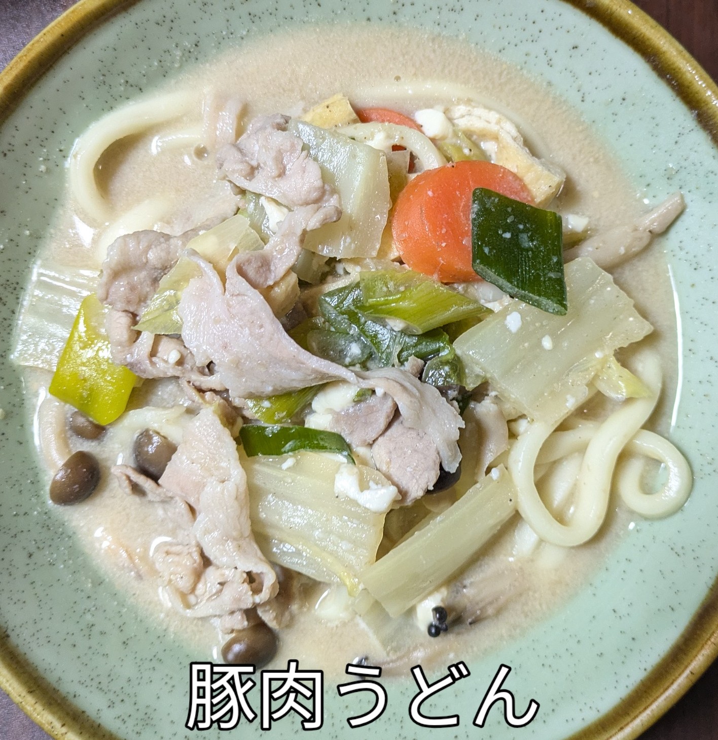 男料理(昼食)豚肉うどん  長ネギ  白菜   人参   なめこ   を入れました