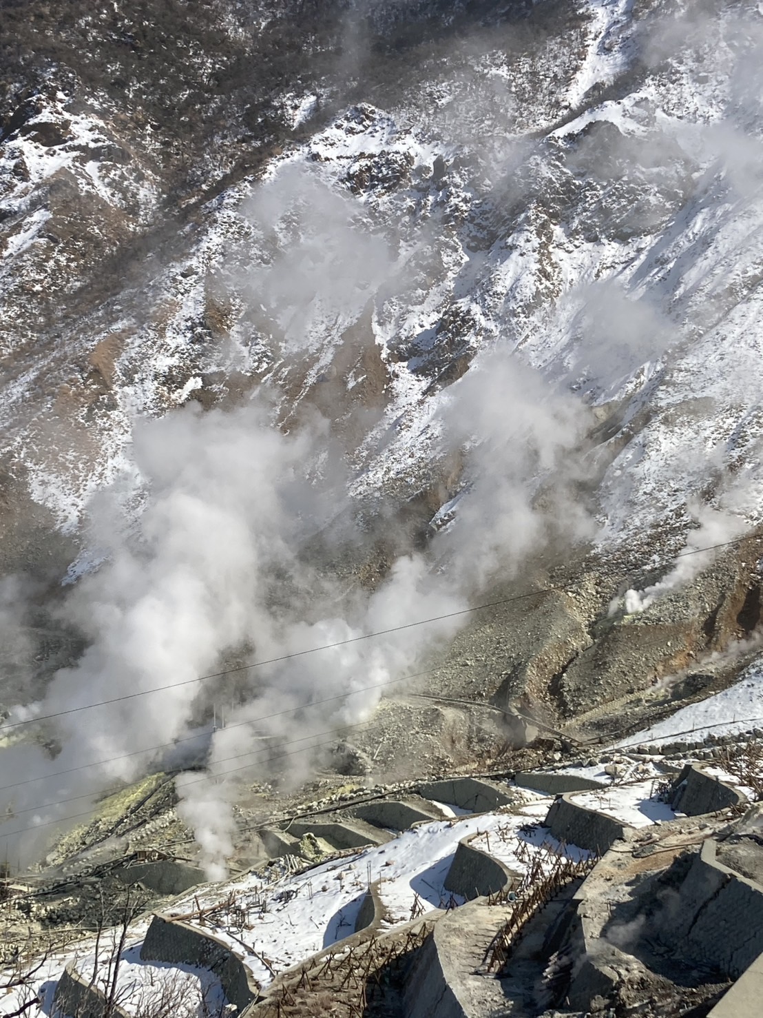 大涌谷は少し雪が積もっていました  展望台は硫黄の臭いがします