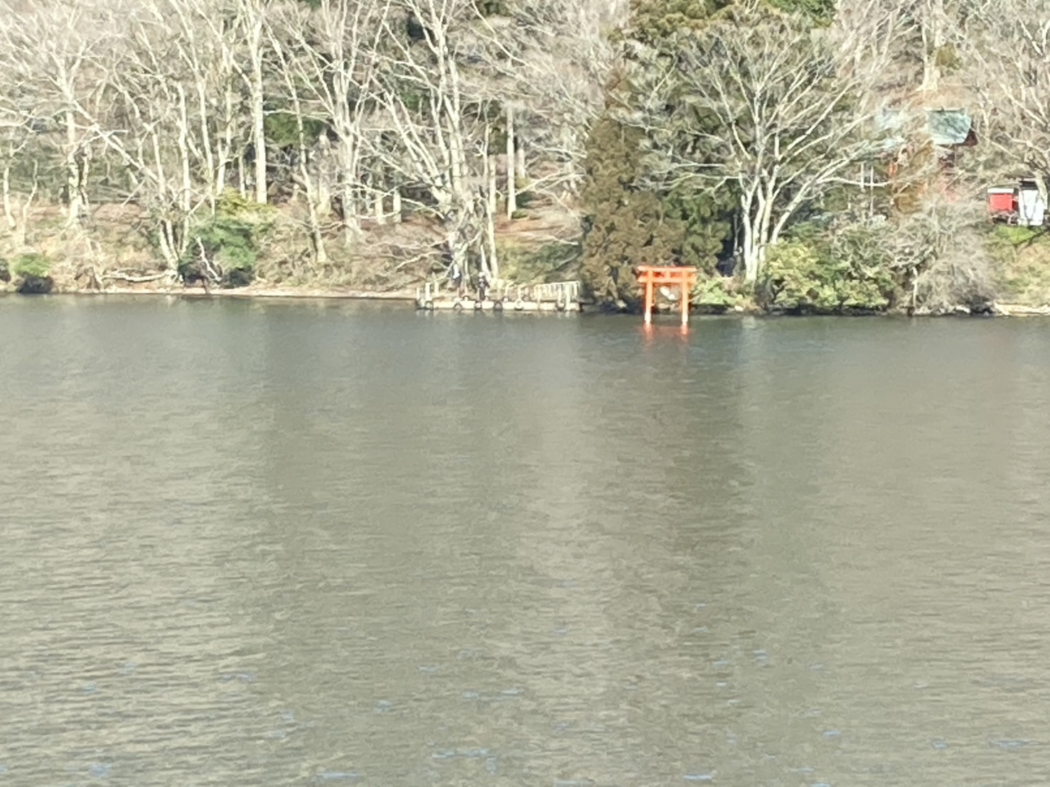海賊船から 芦ノ湖の湖畔の 箱根神社の赤い鳥居⛩️を撮影しました