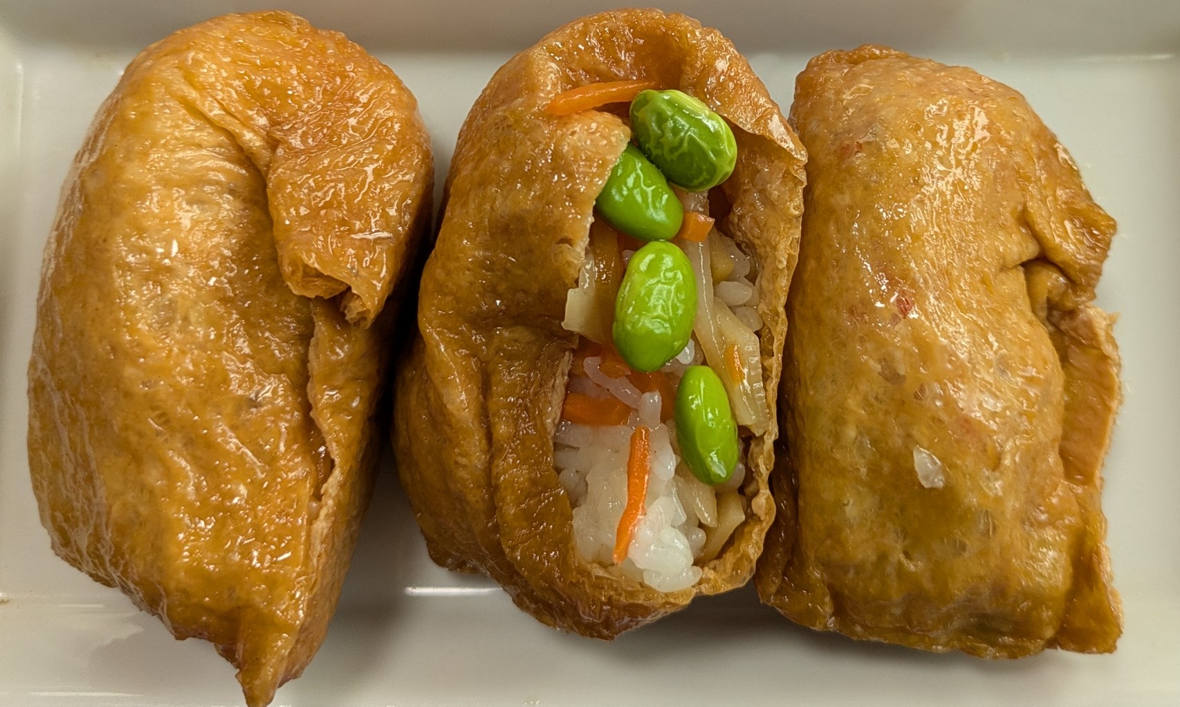 男料理(昼食)おいなりさん   彩りに枝豆をトッピングしています