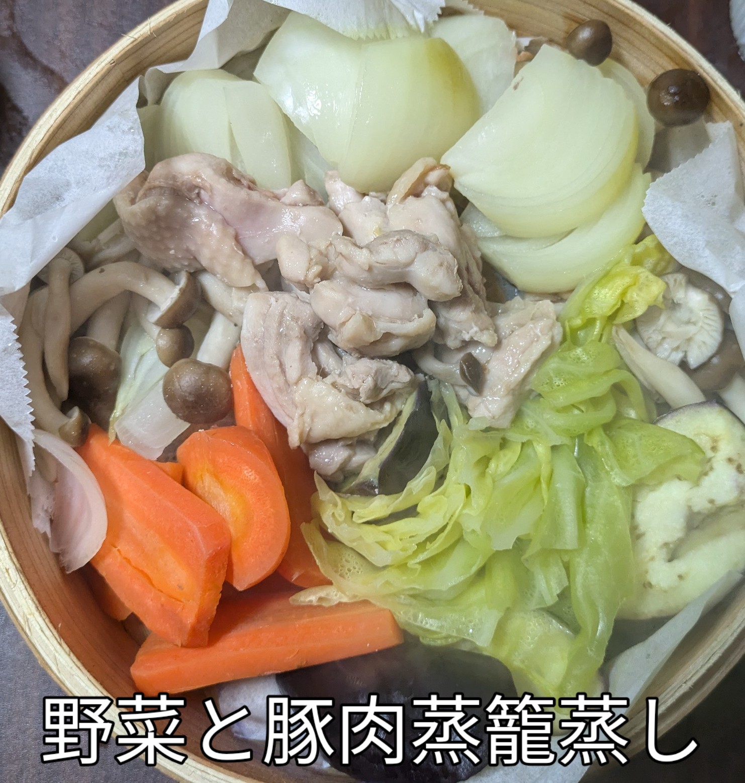男料理(夕食)野菜と豚肉の蒸籠蒸し    野菜が甘くて美味しいです