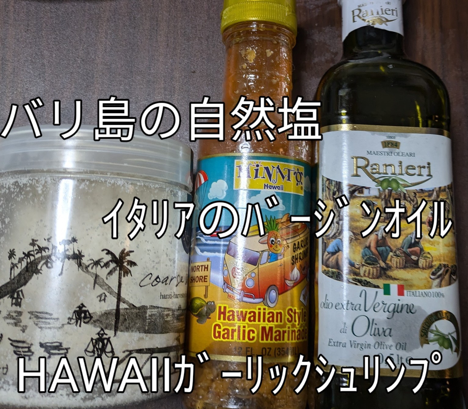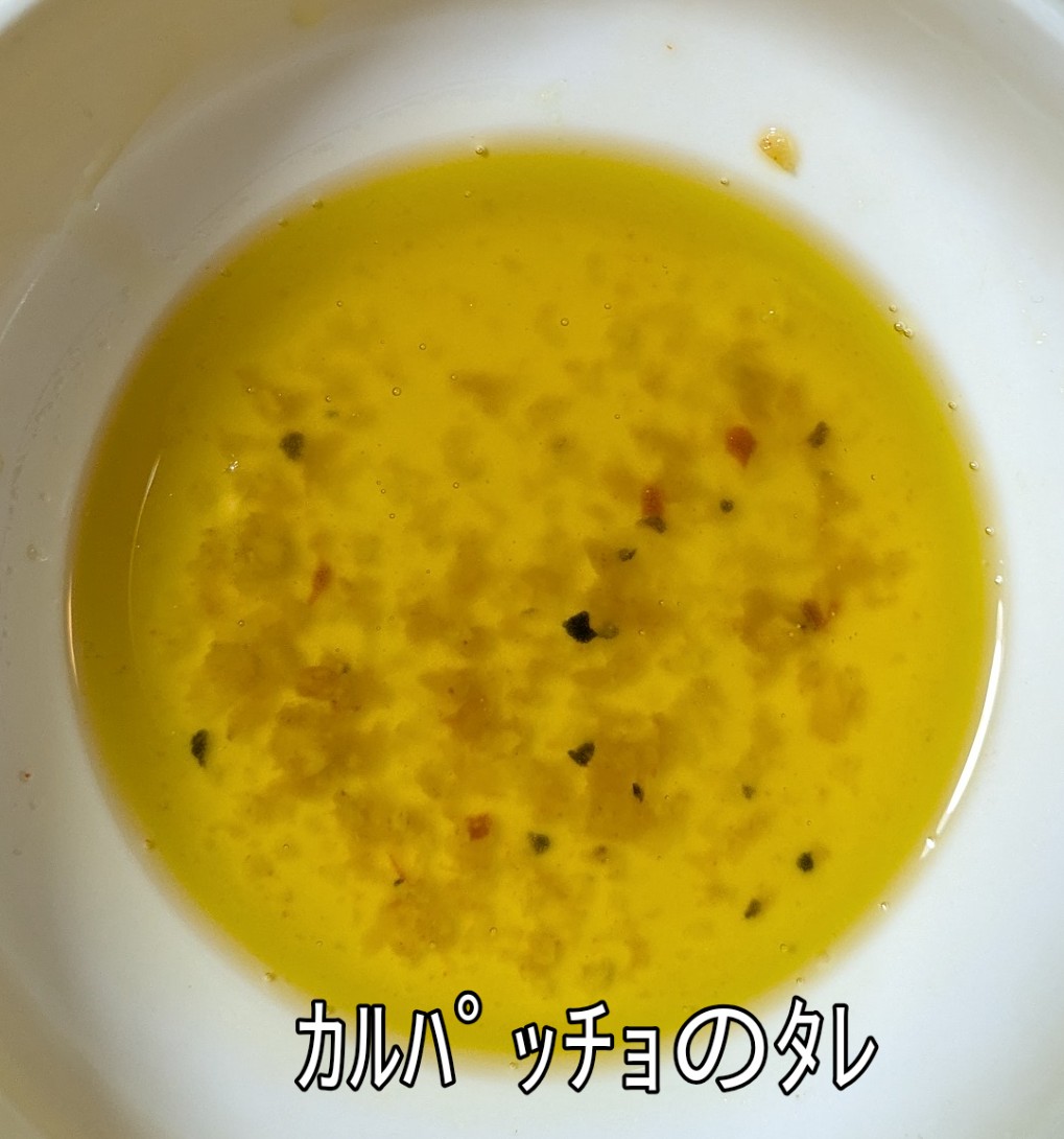 イタリア🇮🇹バージンオイル  HAWAIIのガーリックシュリンプ  バリ島の自然塩    以上3種類を混ぜて特製カルパッチョのタレを作りました