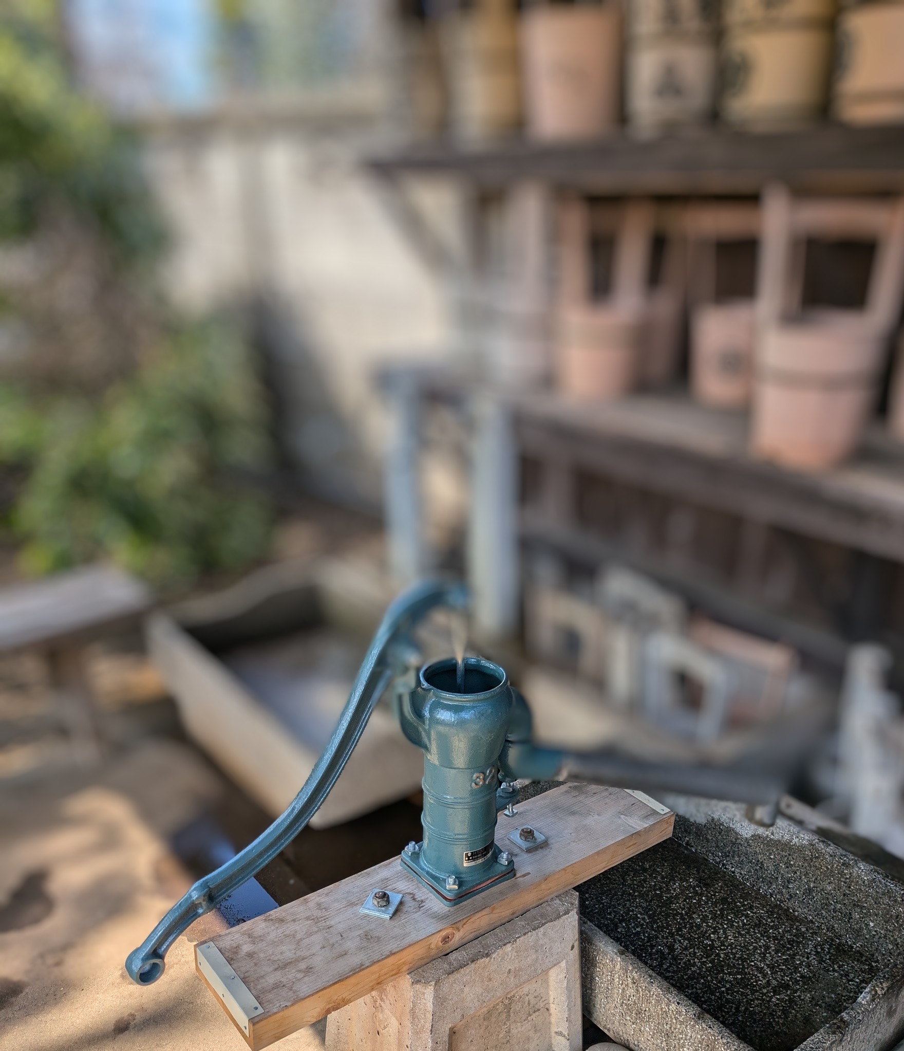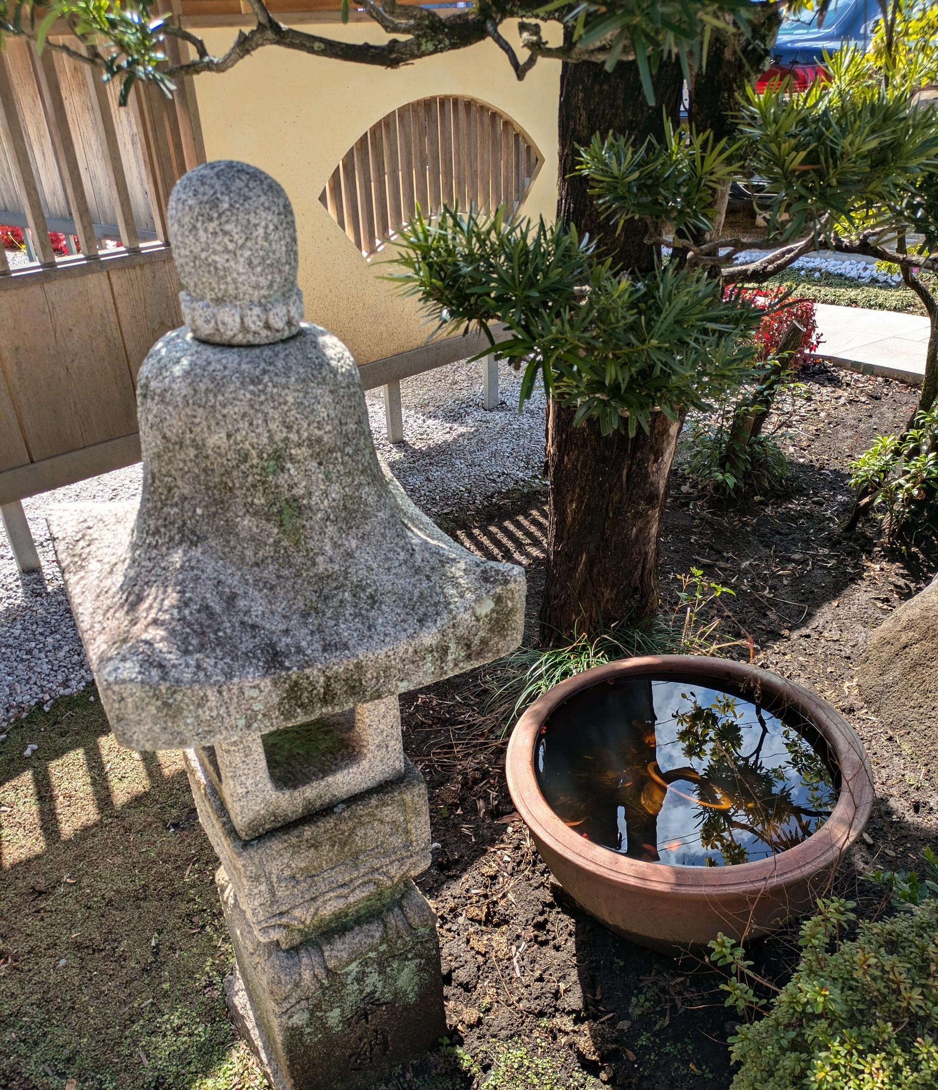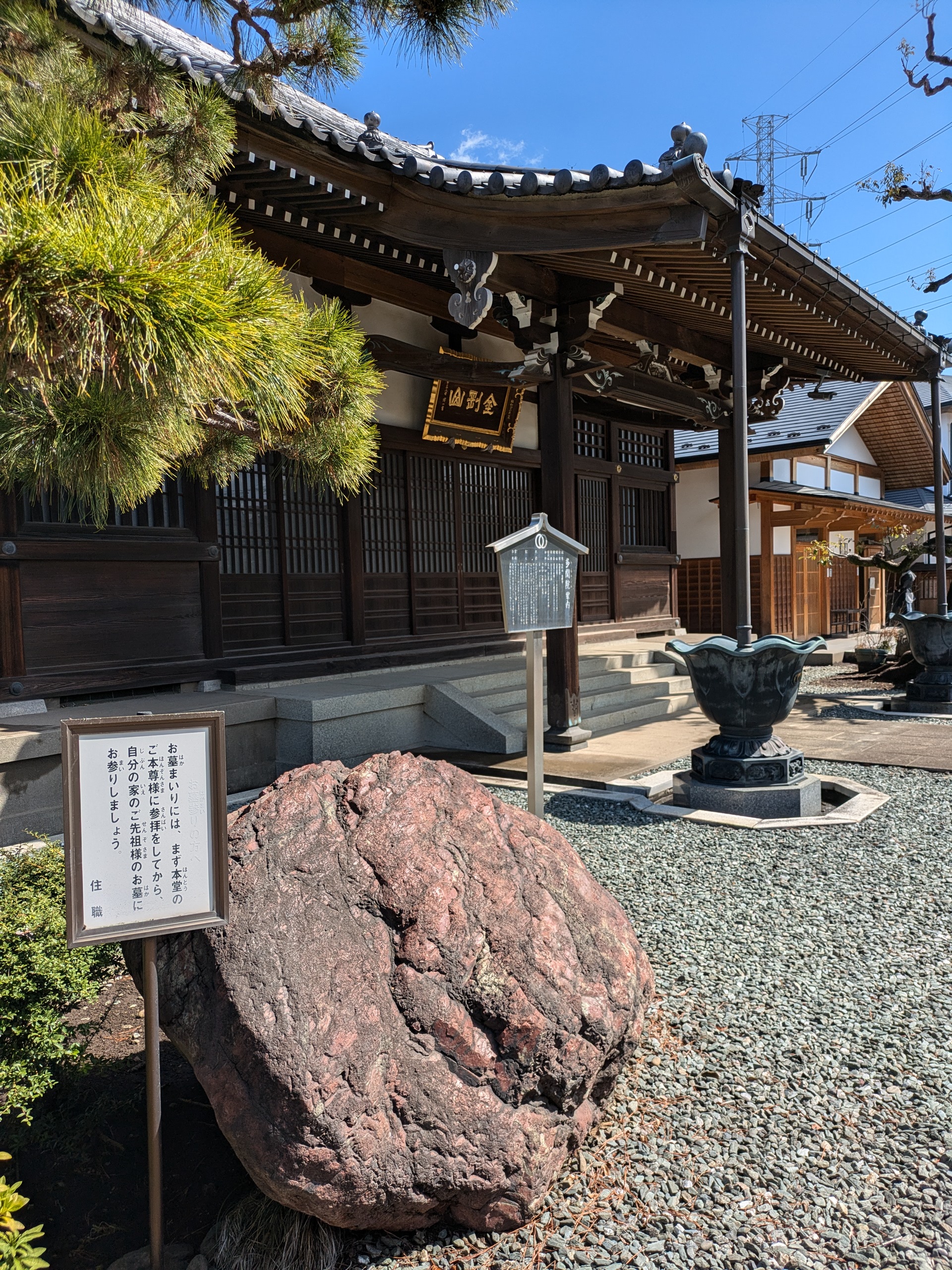 多門院本殿正面左側から大きな赤い石を入れ撮影しました