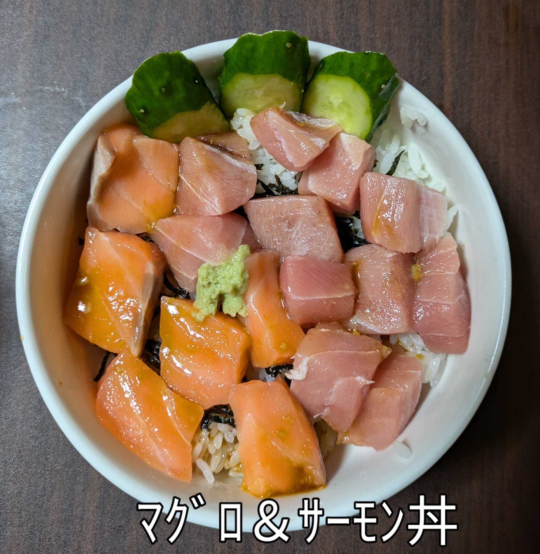 男料理(夕食)マグロ&サーモン丼  お刺身を盛り付け海鮮丼に