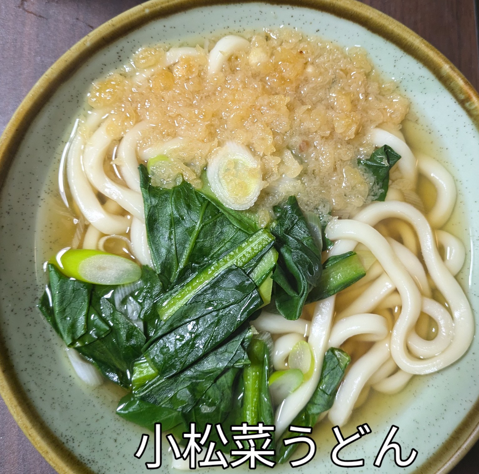 男料理(昼食)小松菜うどん   てんやから頂いた揚げ玉を使いました