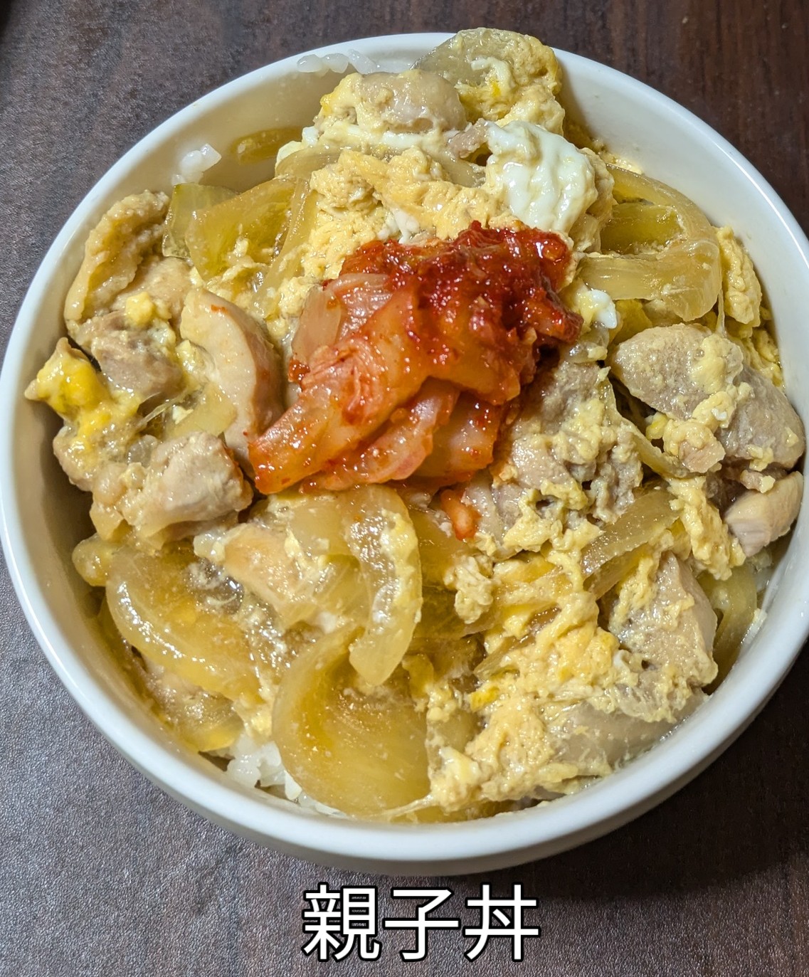 男料理(昼食)親子丼   彩りに真ん中にキムチを添えました