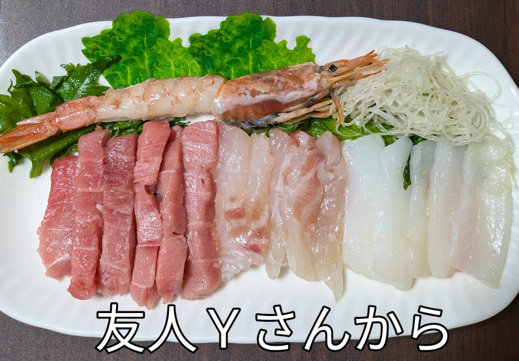 友人Sさん宅でお花見飲み会があり  食べきれないお刺身をお土産で頂きました    中トロ  真鯛  イカ  エビ  のお刺身美味しかったです