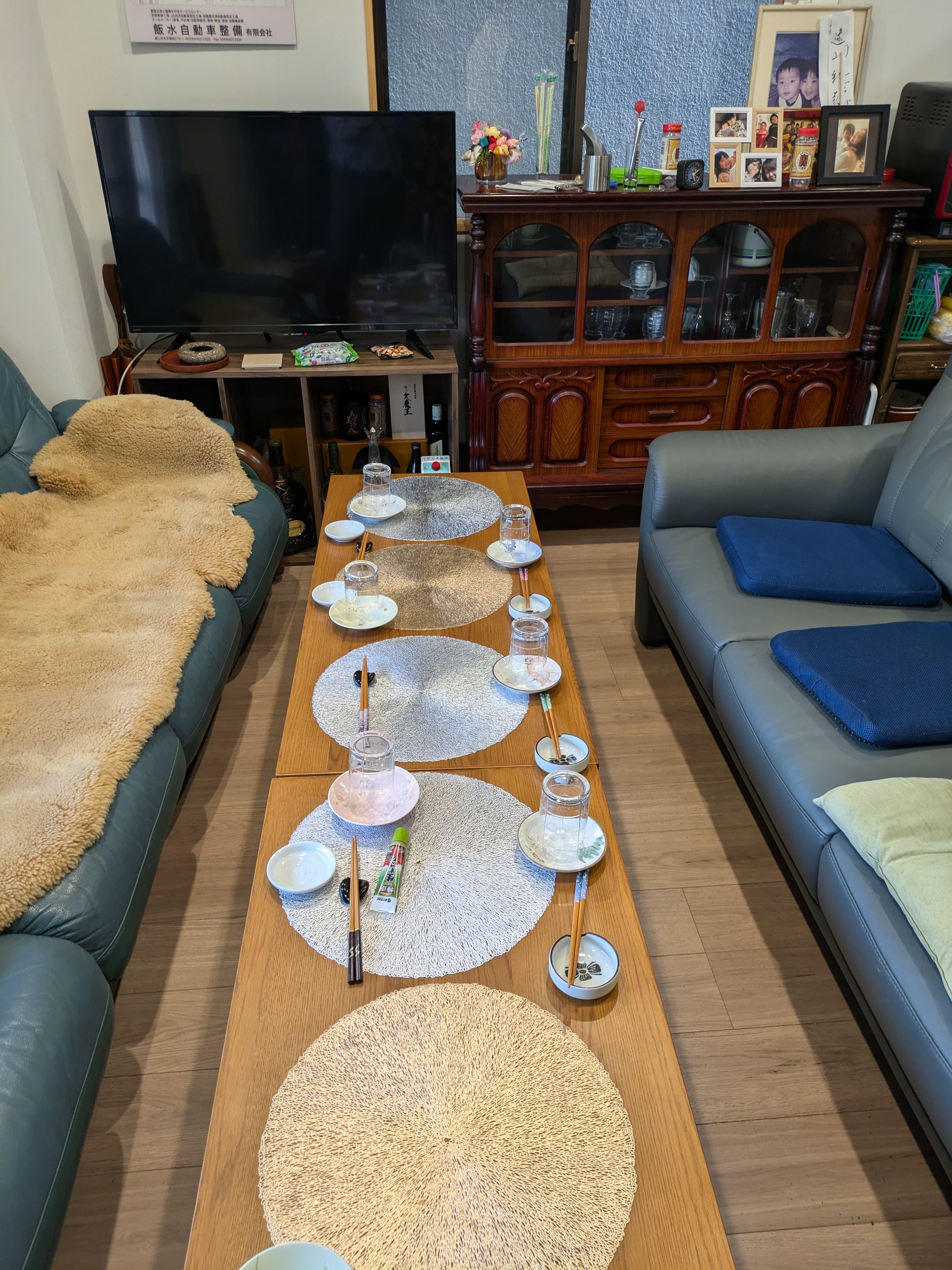 8人座れるソファーとリフォームした東側の広いガラス窓からは