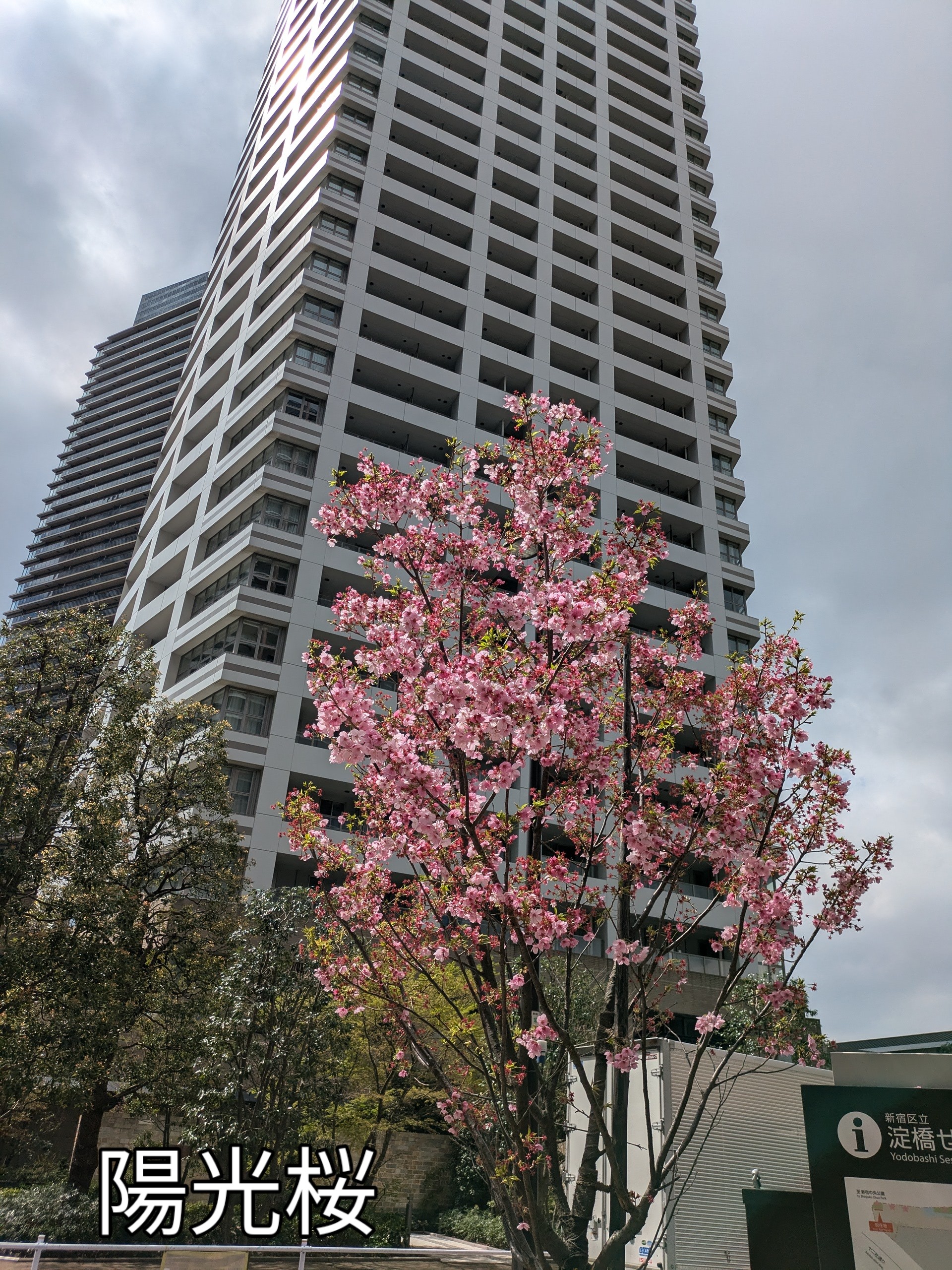 西新宿の60階建ての高層マンションの前に咲く陽光桜が鮮やかで綺麗