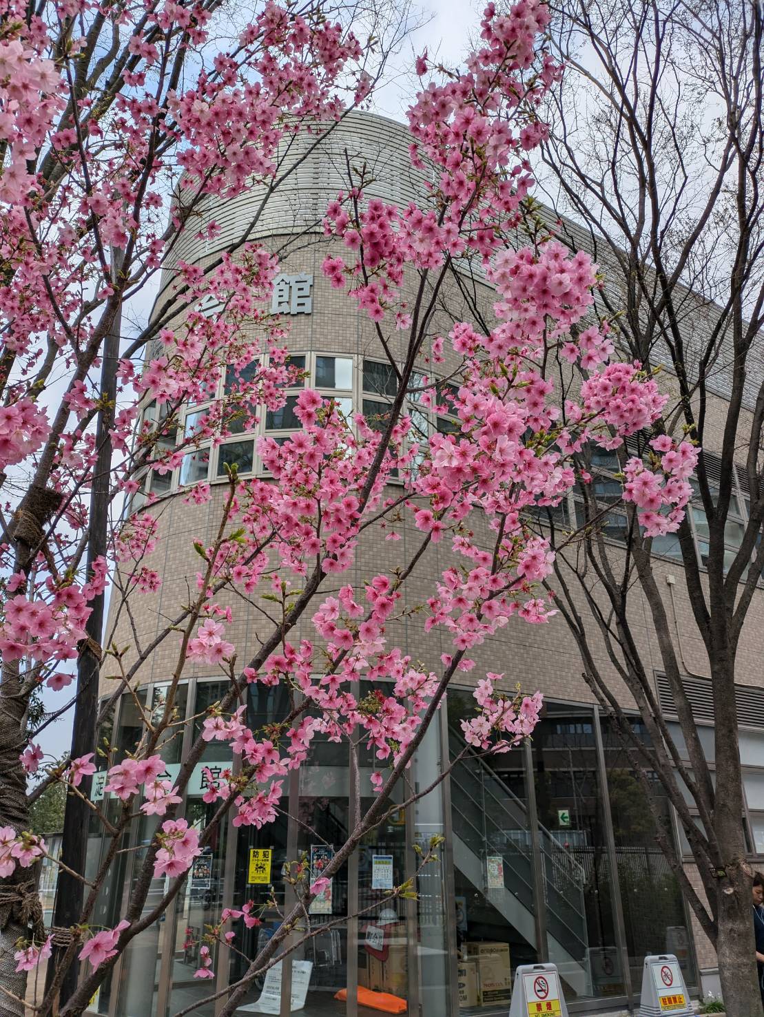 淀橋会館(地元の会館)1階は信用金庫の前に咲く陽光桜(3/28撮影)