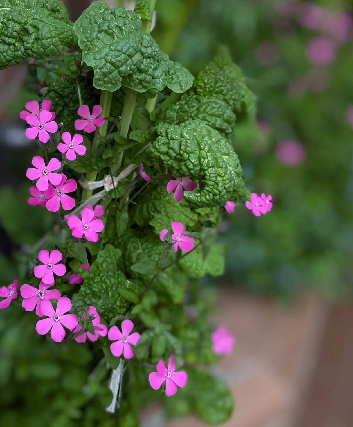シレネ・カロニアナピンクの花の背景をスマホでぼかしました