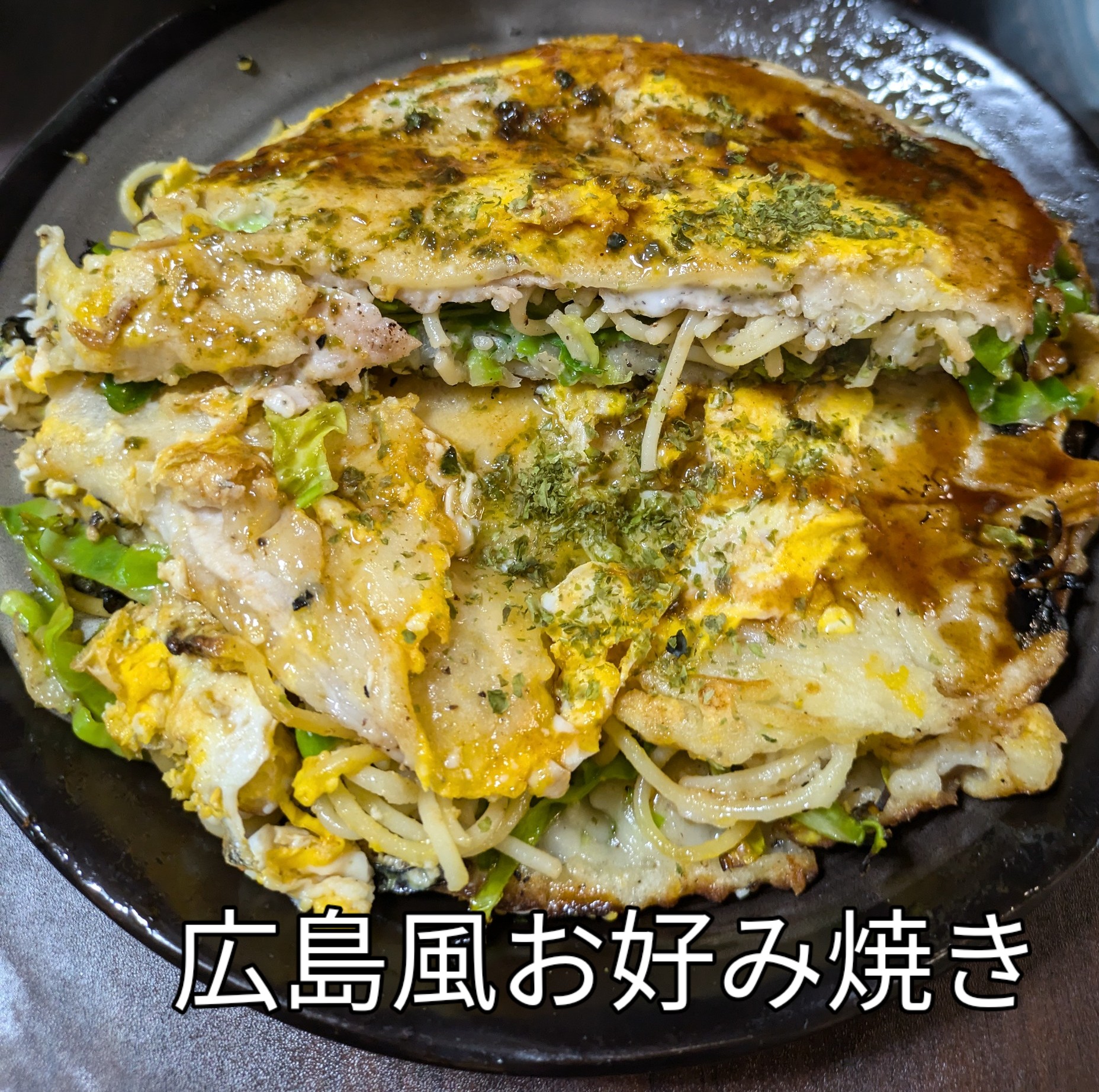 お好み焼きの真ん中にパスタやキャベツを入れかさ増ししました