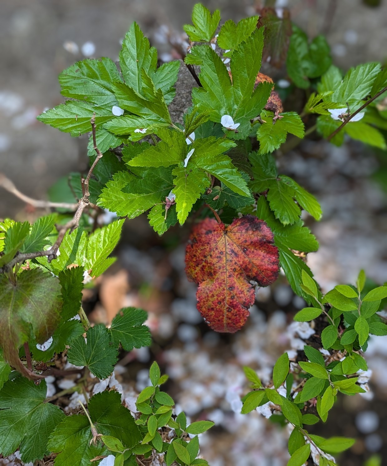 紅葉した葉と桜のが散った花びらをコラボ撮影しました
