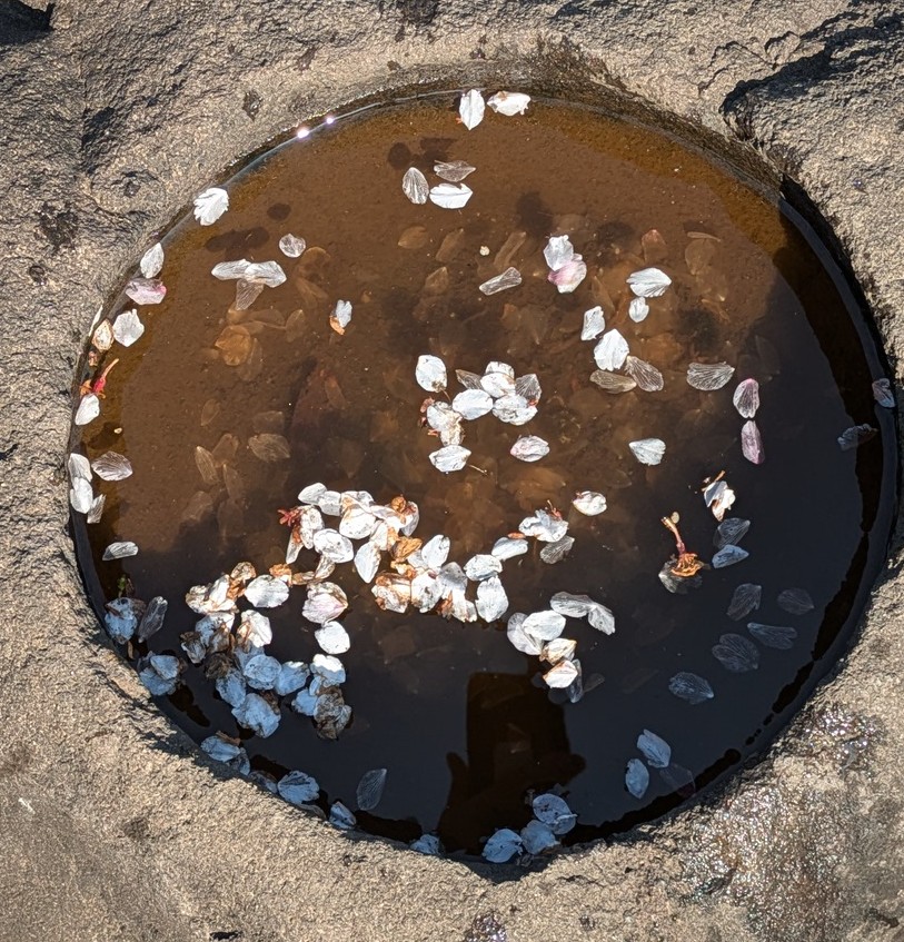 手水鉢に浮かぶミニ花筏をアップ撮影しました