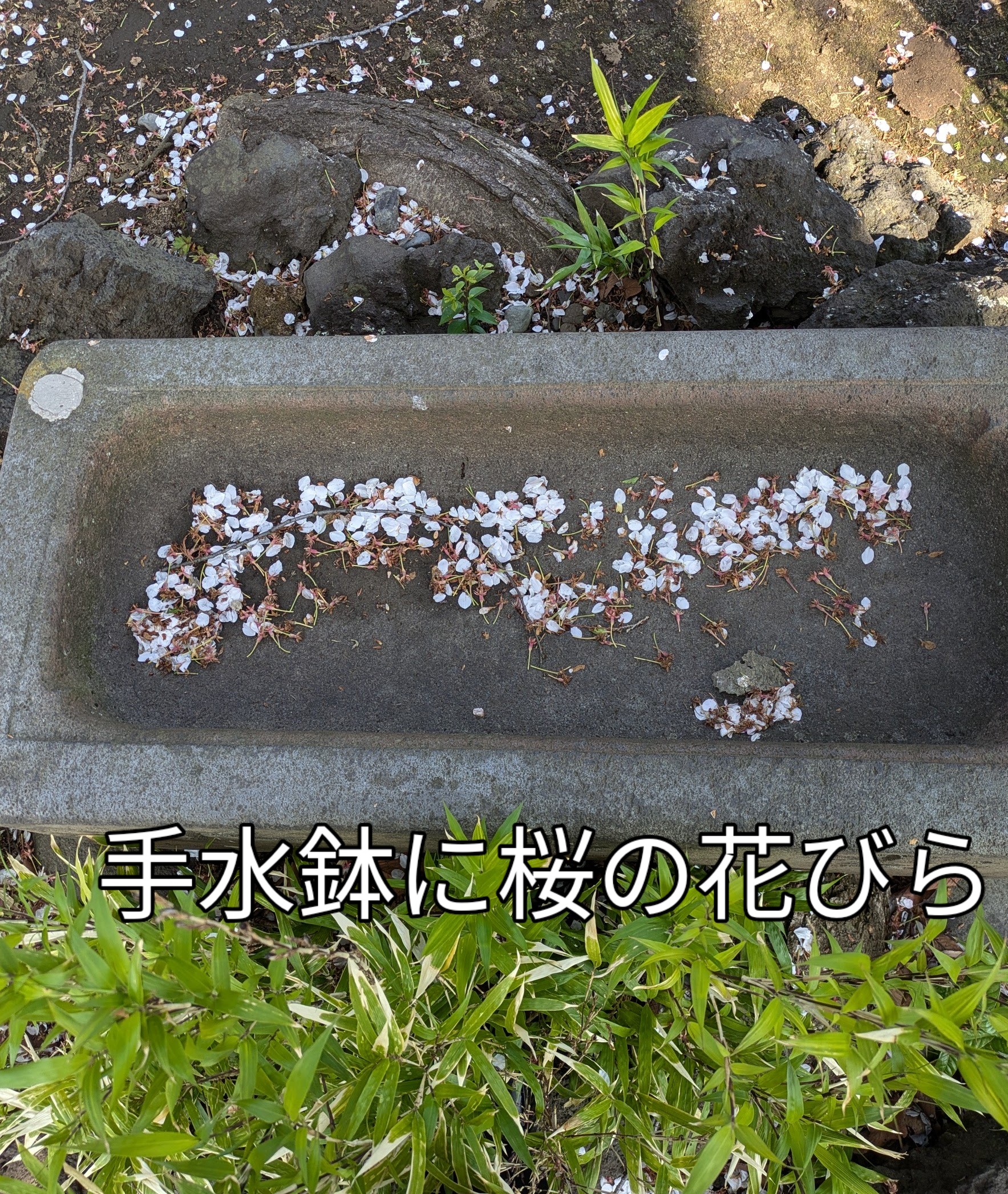 細長い手水鉢にもたくさんの桜の花びらが落ちていました