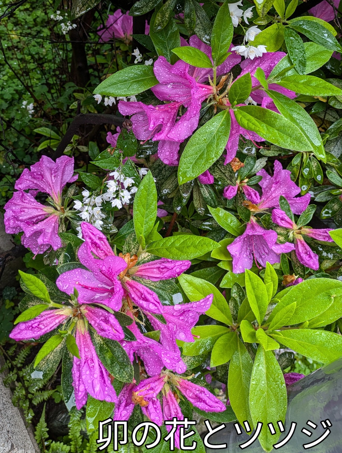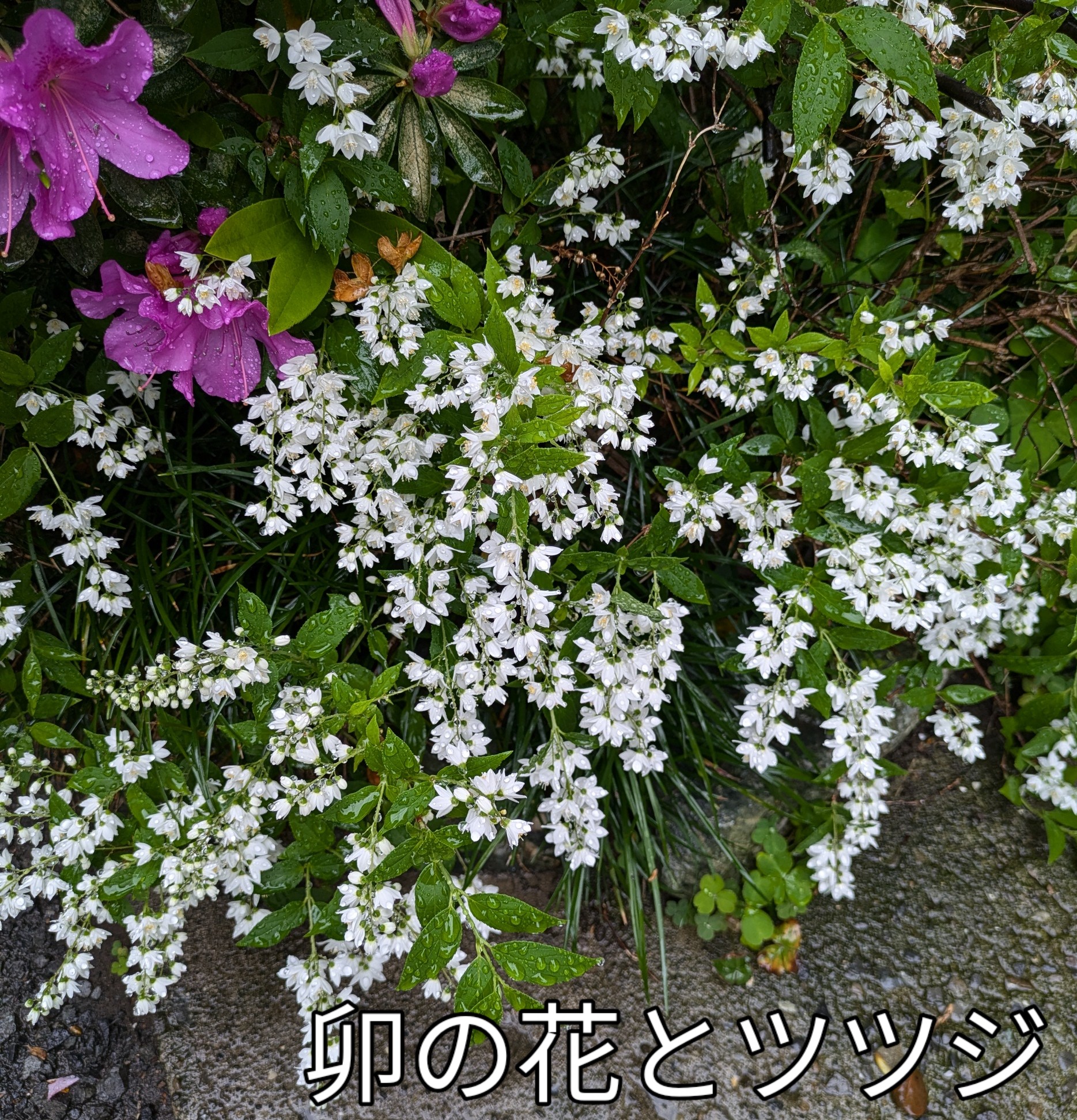 自宅横に 真っ白な卯の花と赤いツツジが満開で雨に濡れた花が綺麗