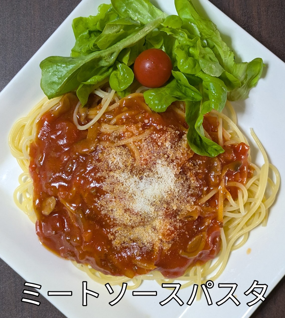男料理(ランチ)ミートソースパスタ サラダ添え 粉チーズかけ