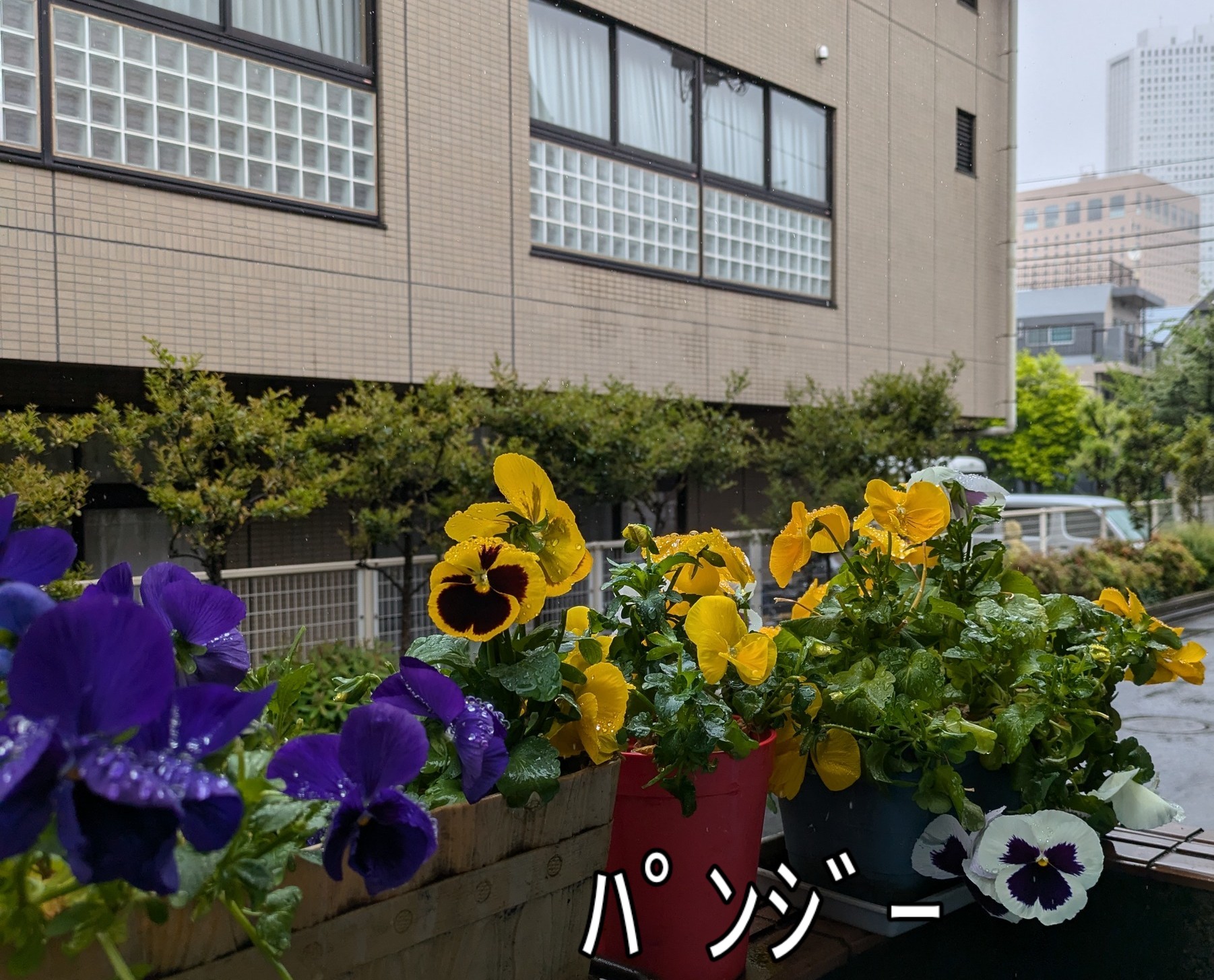 自宅の玄関に飾られた パンジーが雨に濡れて綺麗でした