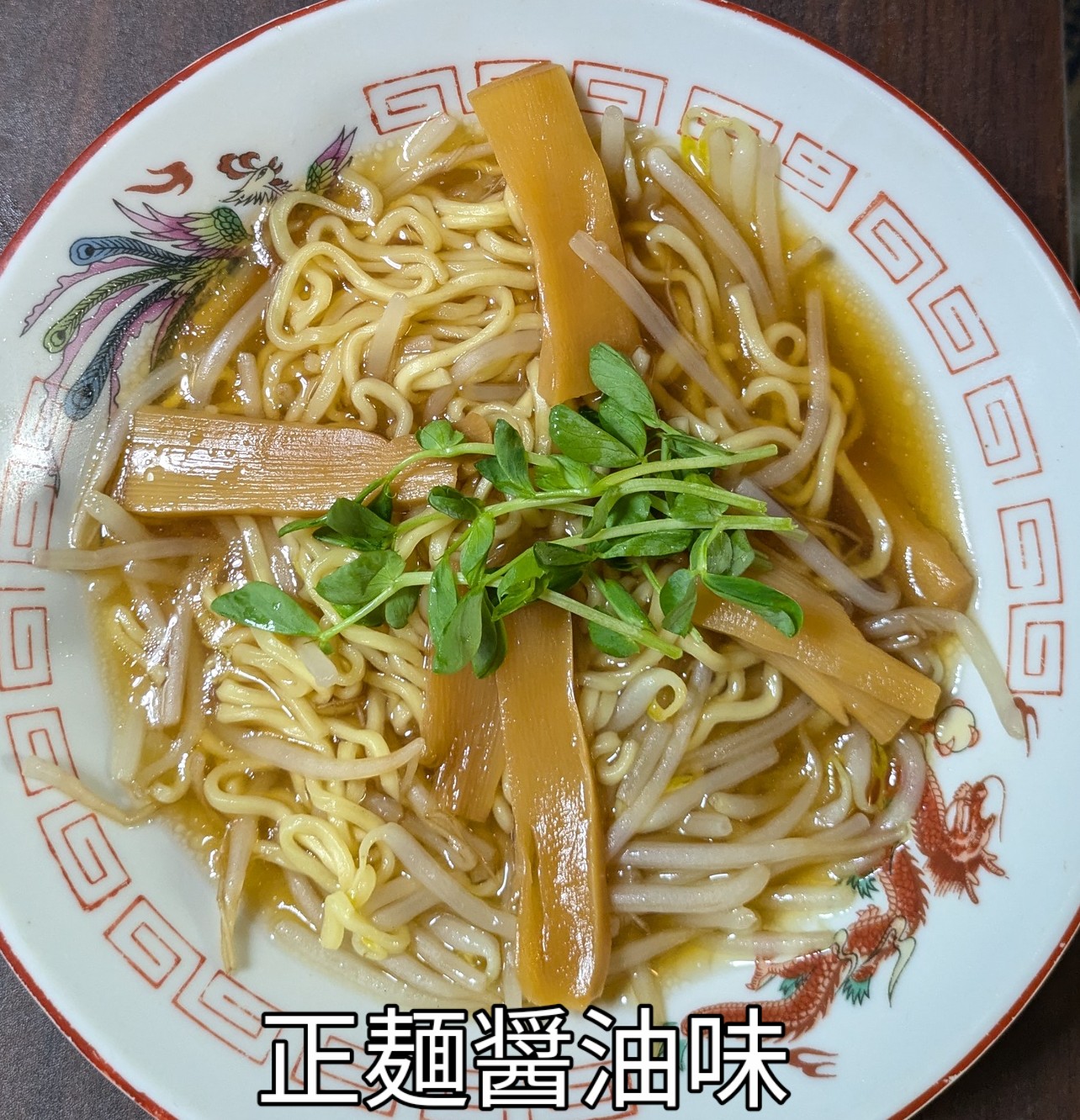 男料理(昼食)正麺醤油味  もやし メンマと豆苗をトッピング
