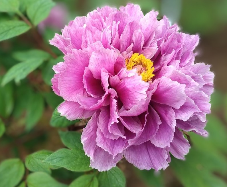 ピンク色の模様が入った牡丹の花弁と黄色のシベが鮮やかで綺麗です