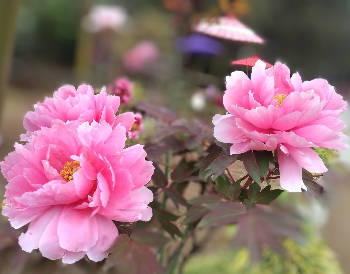 吉祥院境内の庭に咲いた ピンク色の牡丹 背景に日傘が見えます