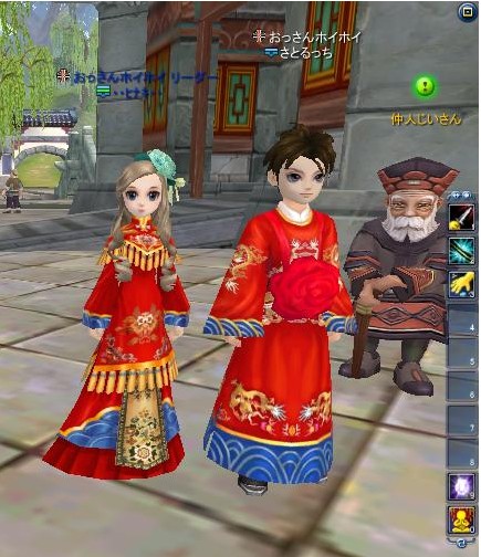 今日は、愛犬の日です。ジャパンケンネルクラブ(JK)が1994(平成6)年に制定しました。1949(昭和24)年のこの日、同クラブの前身である全日本警備犬協会が創立されたのを記念しています。この年に開催された第1回の畜犬展覧会では、全国から240頭の犬が参加したそうです。家にも、犬が居りますが可愛いって感じじゃ無いから今までブログに写真UPした事無いな~^^;友人に写メで送ったことはあるんだけどさ。今日はメイストームデー(5月の嵐の日)って日でもあるらしいけど今日の内容的に向かないので、スルーの方向で^^;では、本題です~。遊ぶ予定の無いゲームをインストールしました。夢世界って言う、オンラインゲームなんですけどね? そのゲーム内に、結婚システムってのがありましてRSを卒業しても、ブログ繋がりで交流が続いてた方が結婚するって事でしたので、折角ならリアルタイムでお祝いの言葉が言いたかったからね^^; 結婚キットを買って、NPCの仲人に話すと結婚クエがあるようでそれをUPしたら、めでたく結婚となり、運営からの、おめでとうログも表示され、沢山の方からの、お祝いのシャウト(RSで言う叫びはこちらでは、お金が必要)あり、もちろん自分は白チャですが、おめでとうの言葉を^^ ヒナキさん、さとるっちさん ご結婚おめでと~です^^ お幸せに~です^^ こちらでも、やっぱ花火はあるんだね~^^ 慣れないゲームなんでSSがちょっと納得行かない部分もありますが UPです~^^ 今回の結婚のお祝いの為だけにインストしたゲームなんで多分次にインする事は無いだろうね^^;最後まで操作慣れなかったし。 今回は珍しくゲームネタでした~。RS関連じゃ無いけどね^^; 今回は以上です~。またね~^^ノシ