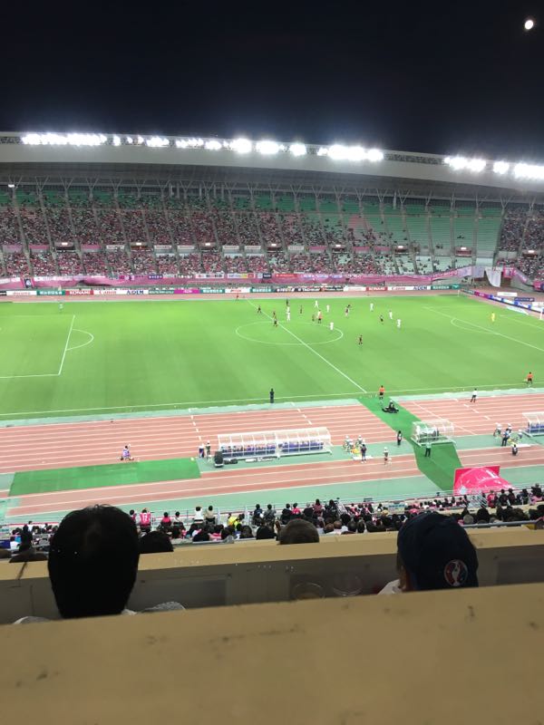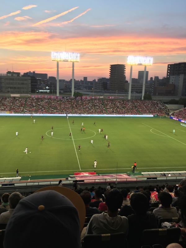 J1第19節 セレッソ大阪vsヴィッセル神戸の試合を観戦。1-1のドロー。以下、試合内容をレポートします。(長文で失礼します。) 【戦術】セレッソは杉本へのくさびのパスを入れてからのポストプレーを軸に山村、柿谷、清武が絡んで攻め、ヴィッセルのボランチの裏を狙ったカウンターを交えて攻める戦術。ヴィッセルは三田、フジタの2ボランチを起点としたビルドアップから左右に展開して両サイドの中盤とサイドバックが連携して攻める戦術。【試合の流れ】(前半)序盤はヴィッセルがボランチの藤田、三田から両サイドを使った攻撃で優位に立ち、24分にティーラトンのスルーパスに郷家がシュートを放ち、31分に三原の右からのクロスにキム・ジンヒョンがはじいたボールに増山が反応してシュートを放つがいずれもバーを外れてしまう。セレッソは特に山口、ソウザの両ボランチが起点にならず、逆にヴィッセルに縦パスを狙われてボールを失う場面が多かったが、40分に得た丸橋の左CKに杉本がニアで合わせてセレッソが先制(判定はヴィッセルのオウンゴール)して前半は1-0でセレッソがリードして終了。(後半)ヴィッセルは開始早々FWを佐々木から交代したウエリントンンにボールが収まり、また三田、藤田を起点に両サイトのスペースを積極的に使って試合を優位に進め、50分にはカウンターからウエリントンが右サイドから持ち込んで上げたクロスに増山がシュートを打つが、キム・ジンヒョンがセーブする。セレッソはその後FWの山村をディフェンスラインに入れて3バック(守備時は5‐4-1)システムに変更してヴィッセルの左右からのクロスを跳ね返してからのカウンターで対抗する展開となる。その後は一進一退で試合が進むが、ヴィッセルは68分に田中を左サイドの中盤に投入して左サイドの郷家とポジションチェンジして両サイドから攻めて再度優位に立ち、73分に藤田からの右CKに田中が合わせてボールがヨニッチに当たってゴールとなり、ヴィッセルが1-1に追いつく。その後は、ヴィッセルの両サイドからの攻撃にセレッソがカウンターで対抗する形が続くが、両者とも得点には至らず、1-1で終了。【システム】(セレッソ大阪)4-4-2(右から)GK キム・ジンヒョンDF 松田、ヨニッチ、木本、丸橋ボランチ 山口、ソウザMF 清武(61分 福満)、柿谷(70分 高木)FW 杉本、山村(ヴィッセル神戸)4-4-2(右から)GK キム・スンギュDF 三原、大崎、渡部、ティーラトン(85分 橋本)ボランチ 三田、藤田MF 増山(68分 田中)、郷家FW 渡邉、佐々木(45分 ウエリントン)【まとめ】セレッソは後半3バックにしてヴィッセルのクロスを終始跳ね返していたが、パスミスが多く、攻撃時の中盤、両サイドバック、ボランチのバランスが悪いゆえに、決定機が作れていない。連戦が続くが、ここが正念場である。ヴィッセルは特に後半は中盤と両サイドバックの連携から何度もクロスを上げていたが、クロスが1テンポ遅いため、セレッソのディフェンスラインを崩すことができなかった。蒸し暑い中での両者互角のゲームで、1-1のスコアは妥当な結果。