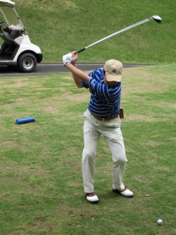 この二日間の日記に多くの方から励ましのコメントをいただきました。 本当にありがとうございますさて、昨日の話ですが、ゴルさんより2PCの時の1番ホールでティーショットを打っているjunhiroの写真をいただきましたちなみにこの日は、ドラは持参せず、Taylormade 初代V SteelのTour Spoonというロフトが立ち気味の3番ウッドでティーショットを打っていましたゴルさんからのメールには『トップは少しはマシになったが下半身はマダマダやな~という』添え書きがありました本当はもっと紳士的なコメントでしたけど、意訳です!(笑)で、今日は練習場に行ってきたのですが、この写真のことは実のところ、まったくもって忘れておりました(爆)最近お気に入りの90Yの狭いレンジで、90球ほどをSWでのAPに、60球を8Iのゆったりスイングに、そして残りの30球をUTとドラに当てましたドラを打っていて右足に体重が乗る感覚がわかるようにバックスイングでの感触をずっと気にしていたのですが、その時に上の写真の右の膝が外に流れている姿が頭に浮かんできましたこれって、もしかして力を逃がしていることになるのか?トップで右ひざを流さず、右足を軸にして上体を捻り上げるような感覚になれば、ショットも安定するし飛距離も伸びるのかなぁと思いながら数発ドラを打ちましたが、、、いいかも♪その事をご近所さんとビリヤードの最中に聞いてみました『ねえ、野球のバックスイングの時に右ひざが外に流れるのは良くない動きなの?』すると彼は、自分で野球のスイングをして確かめてから右足を持ち上げて解説してくれました『うん、そうだね。 力をロスしないように指で地面を掴み、右足の土踏まずをギュッと押し付けるようにして、ふくらはぎ、膝の内側、内腿のラインを意識するかな~。 捻転を使って球を前に飛ばすということは野球でもゴルフでも一緒だからきっとゴルフにも通じるはずだよ!』と話してくれました彼は甲子園常連の高校で野球をやり、大学でも神宮で活躍していたので確かなことでしょう次の練習の時にはこれを意識してみることにしましょう