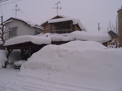 今日やりました今冬初の屋根の雪下ろし。 だって、もう車庫の屋根や家の屋根に1メートル20センチくらいの雪が積もっているんだもん。いつ家がつぶれるかわからない状況でしたから。 ということで、朝湯から帰ってきた朝7時40分からはじめました。 まずは車庫です。車庫が一番危ない状況でしたから。 車庫です。ということで、オラの車をまず隣の家の前の道路に移動。なぜかって?オラの家の車庫は柱しかないので、雪を下ろすと車庫に雪が落ちてきて車がつぶれるからです。ということでエッチラオッチラ、スコップや雪ペラを使って下に雪を下ろしました。必然的に、車庫の前や中に雪が落ちてきて、今度はその雪をかきあげ、積み上げる。 車庫の屋根は大体10時頃終了、足がかじかんだのと疲れたので10時半頃まで休憩。10時半頃から、今度は1階屋根の雪下ろしを行なう。 自宅の屋根雪です。11時頃、1階屋根の雪を下ろしていると、大々先輩からパソコンの印刷のことで問い合わせが、しかたがないので、部屋に戻ってパソコンを立ち上げて説明。これで約20分のロス。 11時ともなると近所の人たちも屋根の雪下ろしや雪かきに精を出している。そして格好なことに太陽が出てきて、日差しが照りつけた。 チャンス!屋根の雪が溶けて落ちる。 太陽が出ているうちにやると屋根を雪の塊が滑っておちるのだ。ということで12時半ころまで3分の2近く終わった。腹が減ったので朝のうちに仕入れたカップヌードルと筋子オニギリで昼食をとる。飯を食っているとき、ドッドッドッと雪の落ちる音が・・・どこかの屋根雪が落ちたらしい。 午後1時、雪下ろし再開。幸いな事にまだ太陽が出ている。 でっ北側の屋根に上ってみると、半分以上雪が落ちていた。そうか、去年3月に1階屋根に2階屋根から氷の塊が落ちて、穴が空いて、屋根を張り替えて新しいトタンになっていたのだ。 1階の穴あき屋根 では、まず新しい北側の雪の半分くらい落ちたところからやるとか思い。とりあえず、トタンはすべるので、雪のあるとこめがけて行ったが、その雪もとも、下に落ちてしまった。まあ下は柔らかい雪だからケガはしんがったが、身体が胸から下が雪に埋まってしまった。なんとか、雪をかきわけて、正面の南側に出るまで雪を踏み固め踏み固め歩き、10分くらいかかったろうか。やっとまた元に戻って今度は2回目の挑戦、しかしまた落ちた。そして悪い事に、どんどん溶けて落ちてきている屋根雪と地面に積もった雪との間に挟まれてしまい身動きがでくきなくなった。そこで手で雪を掻き分け書き分け下に下ろしていくが、下ろすたびに次から次へと落ちてくるものだから、大変。まあ7分くらい、雪をのけると、やっと屋根雪が全部落ちて、なくなった。もう雪は軒下くらいまで、なっているので、今度は、そのまま雪の塊にあがって脱出。しかし、新しいトタン屋根はすべるので、四つんばいになって手袋を脱いで、屋根を上っていく。ε=( ̄。 ̄;A フゥ…やっと北側が終わり、最後に残った南側を下ろす。雪を滑らして落とすのだが、そのうち軒下まで一杯になり、つかえる。その雪を今度は、遠くにやり、雪の落ちる場所を作ってやって、また落とす。 ということで、終わったのは午後2時過ぎだった。 ( ̄u ̄;)ハァハァゼェゼェ… ホントニ疲れた一日でした。 でもこれで当面屋根がつぶれる心配なくなって一安心。あとは2階の屋根雪をこまめに1階屋根に下ろして下まだ下ろす作業はあるが。去年はこれで失敗したから・・・・今年は失敗しないようにp(・∩・)qガンバレル。ただ、屋根の軒下まで雪が来たので、家の中真っ暗・・・春まで太陽の入り込まないクラガリで暮らさなければなりません。フカイタメイキ(;д;)=3=3=3=3ということで、雪下ろしのあとの自宅です。
