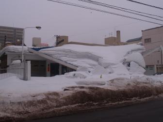 今朝、バスを降りて、職場に向かって歩いていると、2年位前につぶれたガソリンスタンドの屋根がベシャッとつぶれているではないか。 中旬に降った、雨が雪にしみこみ、さらに重たくなってつぶれたのであろう。 そういえば中旬にも、雪の重みで家がつぶれて、足が悪くて歩けない人が重傷をおったというのもありました。 雪に雨がしみこめば、重くなり本当に怖いんですよ。(((゛◇゛)))カタカタカタカタ