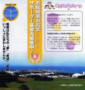 マグロの町大間に市民風車を回そう オラの八戸の友人が、マグロの町大間で、市民風車を作りました。いま、そのサポーター基金を募集しています。 今月一杯、募集していますので、「資源循環型社会」を作りだすために、あなたもサポーターになって、風車に自分の名前を刻んでみませんか?基金募集の案内1.名 称 :「市民風車・おおま」サポーター基金2.募集単位:5万円(一口)3.募集目標:2000万円4.募集期間:2月28日まで5.拠出期間:2023年の事業終了時6.拠 出 者:拠出者は幣法人のサポータ(協力社員)となり社員総会に 出席できます。但し。議決権はございません。7.精 算 :清算の際、基金をお返しします。又、残余財産は拠出額に 応じて配分します。 万が一、元本割れしたような場合でも、私達社員の基金に 優先して返還いたします。※詳細はチラシを参照ください。市民風車おおま チラシ表市民風車おおま チラシ裏お問い合わせ資料請求先 有限責任中間法人市民風力発電おおま 電話 0178-72-3455 FAX0178-43-0676 E-MAIL t-tomioka21@ybb.ne.jp「ちょっと5万円は高すぎるし、17年後の5万といったってなー」と思った方!朗報です。「励ましカンパ」なら、お金は返ってきませんが、一口1万円から、風車に名前を刻むことが出来ます。学生は、なんとその半額(5千円)から名前を刻めます。※励ましカンパとは 5万円未満をカンパとして、非特定営利法人活動法人グリーンシティが受け取り、まとめて有限責任中間法人市民風力発電おおまへ基金として拠出いたします。したがって、市民出資やサポーター基金と異なり、お金は戻りませんし配当もございませんが、希望者は風車タワーの根元に記名できます。原則として一口1万円以上としますが、学生は半額からとします。複数の名前で記名を希望する場合は、それに見合った口数をお申し込みください。以下の郵便振替口座をご利用ください。郵便振替口座 番号 02280-3-88866 加入者名 特定非営利活動法人グリーンシティお問い合わせ先 特定非営利活動法人グリーンシティ住所 :〒039-1166 八戸市根城9丁目22番18号電話 :0178-72-3633FAX :0178-43-0676E-MAIL:office@h-greencity.orgなお試運転が明日2月7日から始まり、営業運転は2月中旬になるそうです。設置中の風車設置中の風車取り付け完成した風車今日2月6日の地元・東奥日報紙におおま市民風車のことが載っています。以下、東奥日報紙から八戸市の特定非営利活動法人(NPO法人)グリーンシティ(富岡敏夫理事長)が中心となって大間町二ツ石に建設していた風力発電の市民風車が完成し、今月中旬から営業運転を始める。地元の人の理解と協力を得ようと、同NPOと事業主体の「有限責任中間法人市民風力発電おおま」は四日、同町漁業活性化センターで市民風車フォーラムを開いた。 完成したのは出力千キロワットの風車一基。全国で六基目、県内では鯵ケ沢町の「市民風車わんず」に続く二基目の市民風車となる。 年間発電量は約二百七十万キロワット時(一般家庭の約八百戸分に相当)で、東北電力に売電する。期間は十七年間。総事業費は約二億六千万円で、うち45%は新エネルギー・産業技術総合開発機構(NEDO)の補助金を充てた。 「みんなでまわそう市民風車!」と題したフォーラムでは、富岡理事長が参加した十数人に事業概要を説明。「地域の風は貴重な資源。活用してみなさんと一緒に町を元気にしていきたい」と語り、事業への参加を呼び掛けた。 グリーンシティと市民風力発電おおまは風力発電に対する寄付、基金を募っている。協力した人の名前を風車に記入する制度もある。問い合わせはグリーンシティ(電話0178-72-3363)へ。