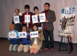シネカノンニュースに、オラの出る映画「青いうた 青春編」の2月16日の完成披露試写会の様子が出ていましたので転載します。以下転載GW公開『青いうた~のど自慢青春編~』完成披露試写が行われました!井筒和幸監督の傑作『のど自慢』から新たな感動が生まれました。青森県むつ市を舞台に、中学を卒業したばかりの若者四人の心情が切なく絡み合い、それぞれの絆が色褪せる事のない名曲の数々にのせて心に刻み込まれる。観る者誰もがその胸に秘めた淡い想いを蘇らせ、明日への希望が湧いてくる青春群像劇です。 その『青いうた~のど自慢青春編~』の舞台挨拶付き完成披露試写が2月16日(木)スペースFS汐留にて行われました。上映後の舞台挨拶で司会をされたのは、かつて「のど自慢」の司会を担当し、映画にも出演している生方恵一アナウンサー。満席の会場に拍手が響く中、「のど自慢」のテーマに乗って金田敬監督、濱田岳さん、冨浦智嗣くん、落合扶樹さん、寺島咲さん、そして斉藤由貴さんが登場しました。主演を務めた濱田さんは「今はホットしている。毎日の撮影に気をはって演じました。」と語り、冨浦くんは、むつ市の中学校で実際の生徒たちと合唱するシーンについて「不安だったけど、皆さんが温かく優しく迎えてくれて嬉しかった。」と話してくれました。また落合さんは「(ロケ地となった)青森は寒かったけど、スタッフやキャストのやる気は熱くてとてもいい作品になったと思っています。」と話せば、斉藤さんの娘役を演じた寺島さんは「斉藤さんが歌っている姿にとても感動しました。」とコメント。その斉藤さんは「(寺島さんの母親役を演じて)実際に自分にも子供がいるけれど、成長するとこんなお嬢さんになるのかな、人生が進んできているなと感じました。この作品は、サイダーみたいな映画だと思った。泡がコップの上に行くまでの短い時間の美しさがある作品。こんな作品に参加できて嬉しい。」と話して下さいました。最後に金田監督から「次代を担う若者たちが懸命になって撮りあげた作品です。彼らの歌が全国の皆さんに届くようにこれから頑張りたいです。」とコメント。映画『青いうた~のど自慢青春編~』はシネカノン有楽町/渋谷シネ・アミューズほか全国にてGW公開です。