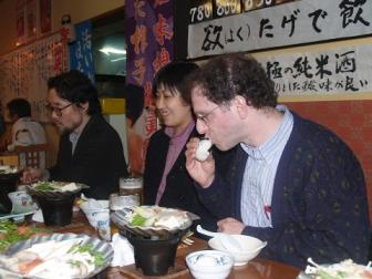 さて、24日のエドゥィン・ライマンさんの、講演のあと、主催者とライマンさんたちで、青森市の郷土料理とネブタ囃子と三味線の店「ねぶたの國たか久」で懇親会を行いました。以下は「たか久」情報店舗名 ねぶたの國 たか久 店舗区分 郷土料理・居酒屋 電話番号 017-723-4416 FAX番号 017-723-4416 定休日 月一回程度日曜休み 座席数 1F60席、2F80(座敷) 駐車場 6台 住所 〒030-0802 青森市本町5-6-11 営業時間 P.M.5:00~P.M.12:00 紹介コメント 連日恒例の三味線演奏・ねぶた太鼓体験と、〆には当店全スタッフによる囃子でいつでもねぶた気分と津軽魂を味わえるお店です。料理も活いか、活鮑等旬の魚、酒は地元青森県内から、焼酎は日本全国から取り揃えております。 おすすめメニュー メニュー名(価格) 板長のおすすめコース (6,300円) コメント 地元八戸沖の深海魚、きんきんの姿焼、大間の鮪を入れた刺身盛り合わせ等旬の食材を取り入れた全七品のおすすめコースです。 メニュー名(価格) 大間の鮪 (2,500円) コメント 「日本一の鮪」と称される鮪で、当店社長自ら大間まで足を運び、買い付けに成功しました。大トロ、中トロ、赤身と味わえます。 メニュー名(価格) ホタテ味噌貝焼 (800円) コメント 地元陸奥湾のほたてと新鮮な野菜を当店自慢の合わせ味噌で煮込み、玉子とじにしていただいて召し上がります。 ここの店の最大の売りは、津軽三味線の第一人者の「山上進さん」の生三味線の演奏とネブタの太鼓をお客さんに叩かせることであろう。ということで、写真で綴るエドウィン・ライマンさんとの懇親シーンです。おにぎりを食べるライマンさんと、野川温子さん(グリーンピースジャパン)、そして通訳をしていただいた田窪雅文さん(ウェブサイト「核情報」主催)三味線生演奏の山上進さん太鼓と三味線津軽民謡を歌うライマンさんと野川さん山上さんが手を取り太鼓の叩き方ヲライマンさんに教える単独で太鼓を叩くライマンさん太鼓を叩く野川さん(初めてとは思えないうまさ!リズム感がいいのかも)1万人訴訟原告団事務局長の山田清彦さん(三沢市議)ねぶた太鼓を叩く鹿内博さん(核燃料廃棄物搬入阻止実行委員会共同代表・県議)鉦を鳴らす鹿内さん尺八を吹く山上進さん山上さんとライマンさん記念の握手