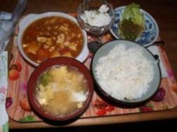 18日の居酒屋ぽーのランチです。600円。メインデッシュは、トマトのマーボー豆腐卵の味噌汁、長いもの千切りとオクラ、チリメンジャコとレタス、ヾ(@⌒¬⌒@)ノ ウマヒ居酒屋ぽー最高