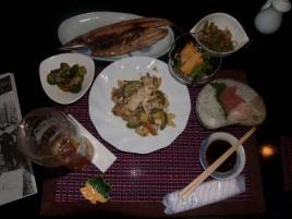 昨日、居酒屋歓都里に行ってきました。おまかせ定食を頼みました。安くてヾ(@⌒¬⌒@)ノ ウマヒィ (値段は言わないでくれとのママの頼みですので言いません)まずはオカズ、サンマの開き、ホヤミズ(ホヤと山菜のミズ)、刺身、ゴーヤチャンプル、コンニャクとササギの炒め物、ゴーヤチャンプル、シャコエビとキュウリの酢の物、 次にサラダ ご飯はなんと、うな丼!それと味噌汁 最後にデザートにフルーツ(メロンとブドウとスイカ)