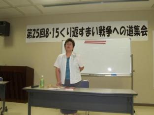 第25回8・15くり返すまい戦争への集会が終戦記念日の8月15日、青森市内で開催されてオラも参加しました。この集会は、毎年終戦記念日の8月15日と12月8日に毎年開催されています。 集会は、靖国神社問題を扱ったビデオ上映のあと、建部玲子元県議が講演。 建部さんは、「靖国思想とは、先の戦争を『正義の戦争』であると位置づけ、あの時代の考え方『聖戦思想』を後世に残そうとしている。」とし、「仮にA級戦犯が分祀されたとしも、首相は参拝すべきではない。明治政府成立以後、日本は脱亜入欧として、アジア侵略の道を歩んできたが、そのバックボーンとして天皇の存在を神格化し、『戦争で死んでも靖国神社に祀られ英霊になる』としてきた」と強調。最後に「先の戦争を真摯に反省し、再び戦争の惨禍をくり返さないためにも、色々、マスコミ等で言われているが、自分の目と耳で確かめ、学習し、平和の道を目指そう」と締めくくった。 オラも高橋哲哉東大教授の「靖国神社」の本を読んだが、この日は、映像とわかりやすい建部さんの説明で、さらに靖国神社への理解が深まった一日であった。講演する建部元県議