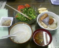 今日は みさちゃん お粥とレトルトオデンとキャベツの千切りとトマトと味噌汁と納豆(笑)。ちょっとキャベツ食べ過ぎました(笑)。