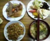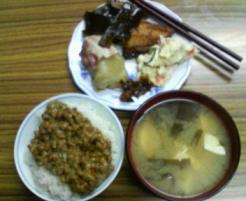 納豆ご飯、味噌汁、おでん、ポテトサラダ、ヒジキ、鶏肉とキャベツの炒めものです。
