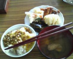 納豆ご飯に、ポテトサラダとホッケと昆布です。