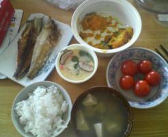 ご飯、蜆の味噌汁、ホッケ焼き魚、ミニトマト、茶碗蒸し、カボチャ煮付けです。