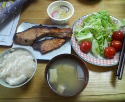 実家で食べた朝食です。ご飯、蜆味噌汁、ブリの照り焼き、レタス、ミニトマト、茶碗蒸しです。