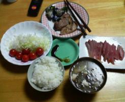 昨日の夕食は実家でした。ご飯、ふのりの味噌汁、焼き豚肉、キャベツ千切り、ミニトマト、鰤刺身です。