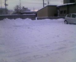 15日、朝の職場の前の駐車場の雪カキ前の写真です。13日と14日と2日、職場に出なかったために前の駐車場は20センチくらい降りました。