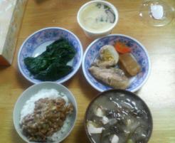昨日の実家での朝食は納豆ご飯、ワカメの味噌汁、ほうれん草のお浸し、茶碗蒸し、手羽先煮付けです。